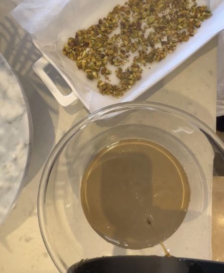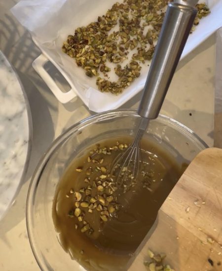 - בקערה קטנה מערבבים טחינה גולמית, מי סוכר ואת יתר הפיסטוקים עד לקבלת תערובת סמיכה ואחידה.
