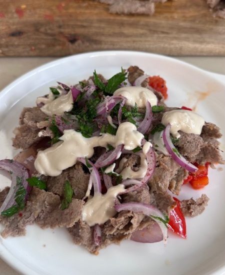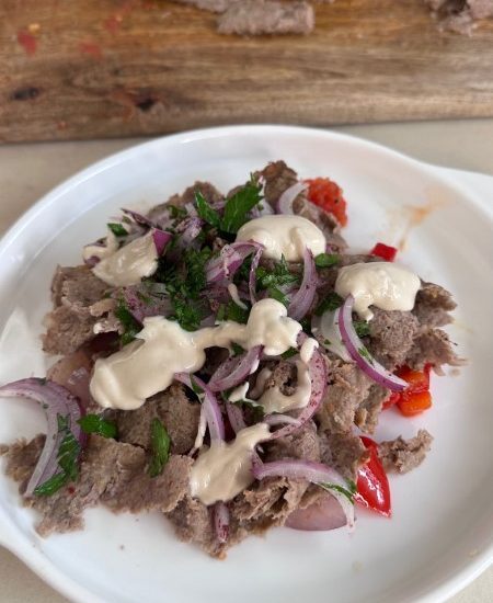 - קוצצים את הירקות השרופים מניחים עליהם קרעי שווארמה, מעליהם סלט פטרוזיליה והזלפה של טחינה מעל הכל.