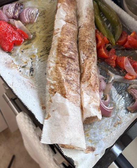 - מניחים את הגלילים בתבנית ולידם את הירקות (עגבניות, פלפלים ובצל)