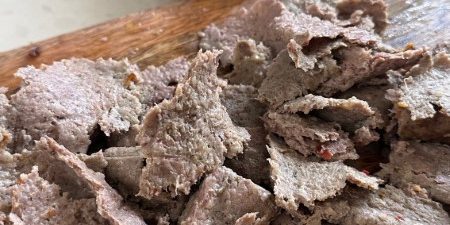 - מסירים את נייר האפייה העליון ומגלגלים לגליל. חוזרים על הפעולה עם הבשר שנשאר (סה”כ 3 גלילים).
